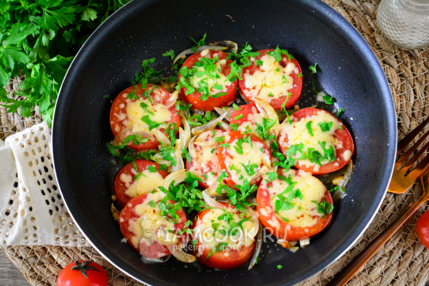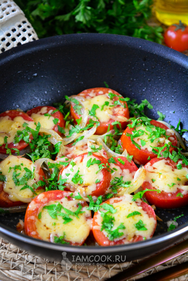 Затем выключите огонь, все готово! Помидоры получились аль-денте, а сыр полностью расплавился. Присыпьте овощи мелко нарезанной петрушкой и подавайте жареные помидоры с сыром к столу (можно и на сковороде).