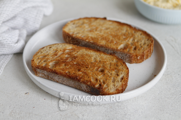 Кусочки хлеба поджарить в тостере или на сухой сковороде.