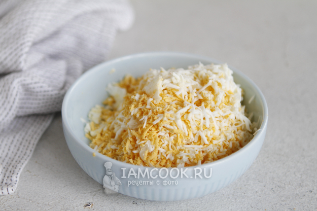 Яйца промыть под проточной водой, выложить в сотейник и отварить вкрутую. Яйца остудить, почистить. Натереть на мелкой терке.