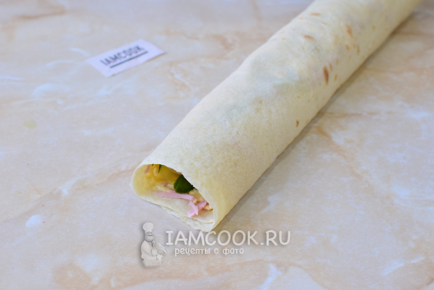 Лаваш вместе с начинкой скрутите в рулет. Дайте ему немного полежать, чтобы он пропитался.