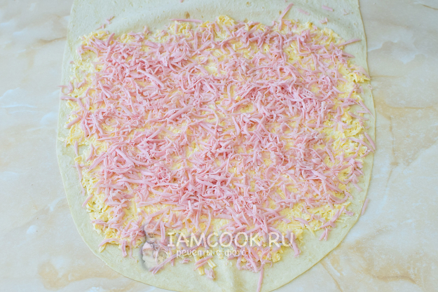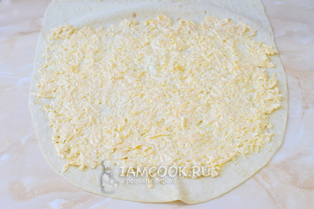 На столе расстелите лист лаваша и распределите по нему подготовленную сырную начинку.