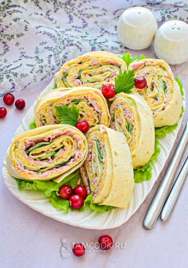 Затем острым ножом нарежьте рулет из лаваша с ветчиной и огурцом на кусочки, разложите на тарелке и подавайте к столу в качестве закуски. Приятного угощения!