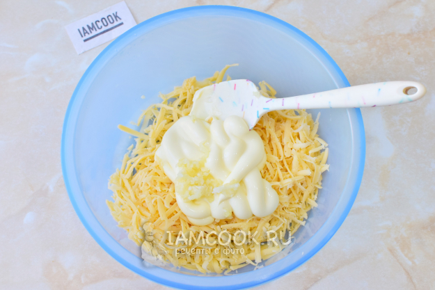 Для начинки потрите сыр на терке и добавьте к нему чеснок и майонез. Перемешайте.