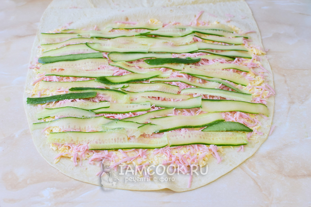 Свежий огурец нарежьте тонкими слайсами и разложите по всей поверхности.
