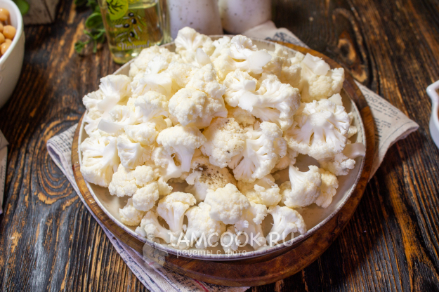Цветную капусту помойте, обсушите и разберите на небольшие соцветия.