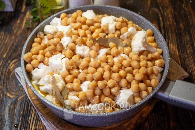 Затем добавьте отваренный нут без жидкости, лавровый лист и варите блюдо под крышкой 15 минут, до мягкости капусты.