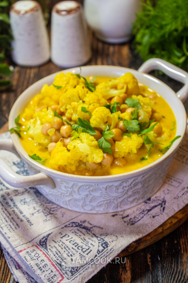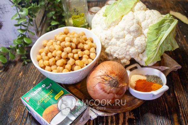 Соберите необходимые продукты для приготовления цветной капусты с нутом. Капусту я взяла свежую, но можно и замороженную, предварительно ее разморозив. В этом рецепте не нужно предварительно отваривать капусту - все тушится в одной сковороде.