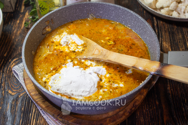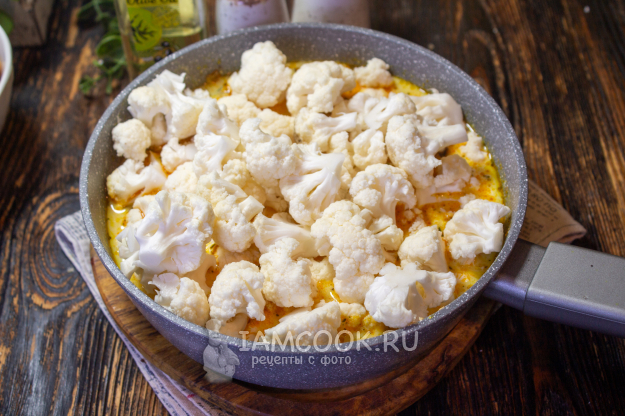 Добавьте цветную капусту, накройте сковороду крышкой и готовьте 5-7 минут.