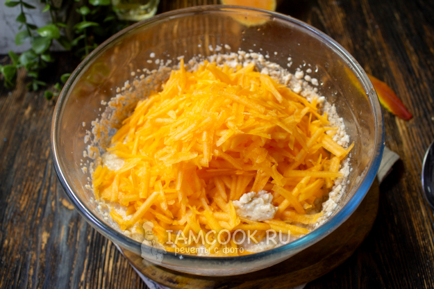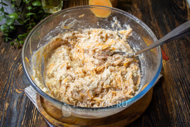 Добавьте натертую тыкву в тесто и хорошо перемешайте.