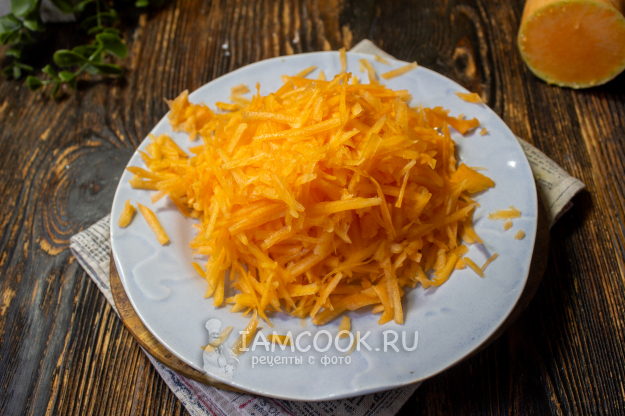 Тыкву очистите и натрите на терке. Нам понадобится 200 граммов уже очищенной тыквы.