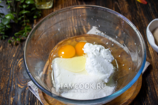 В миску выложите творог, добавьте яйца и греческий йогурт без добавок. Всыпьте сахарозаменитель и ванилин (желательно натуральный или экстракт).