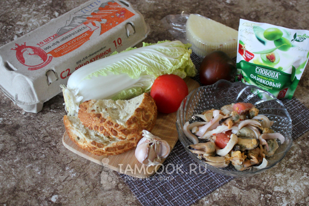 Для салата «Цезарь» с морским коктейлем подготовьте ингредиенты по списку к рецепту. Коктейль из морепродуктов подходит покупной, который в масле или уксусном маринаде. В нём обычно много мидий и кальмаров и нет или мало креветок. А ещё у меня подходящий рецепт для его домашнего приготовления. Дополнительно к нему можно добавить немного красной рыбы слабой соли.