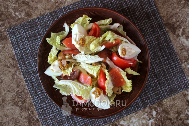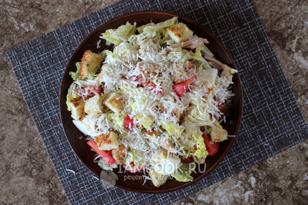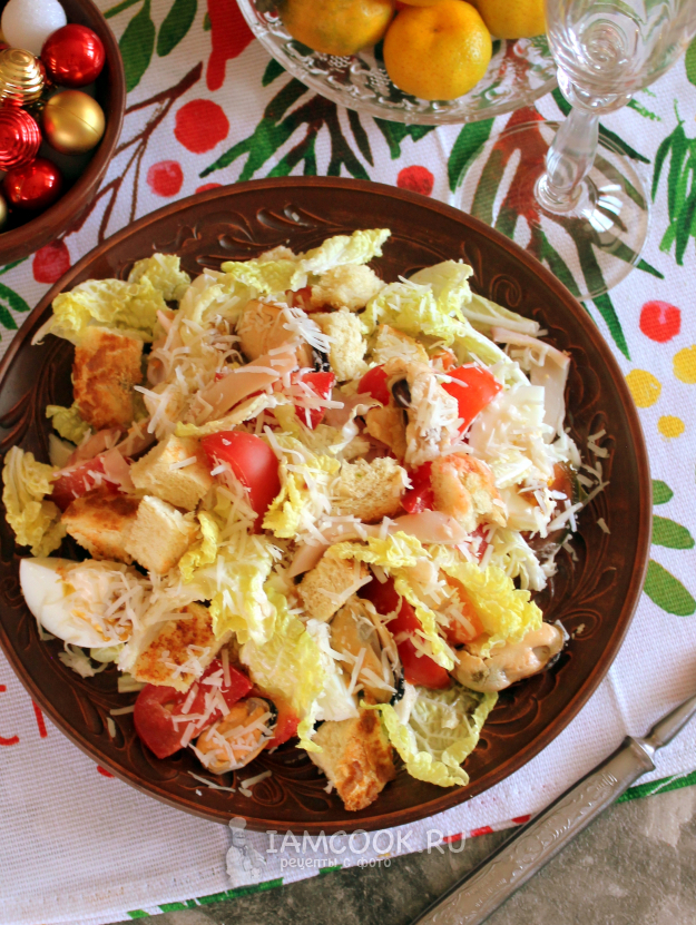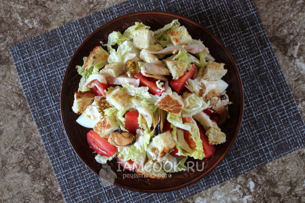 Вариант салата «Цезарь» с морским коктейлем готов, подавайте его сразу же.