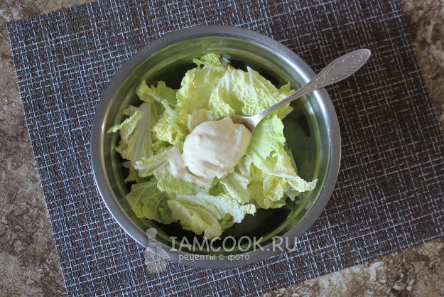 Кусочки салатных листьев перемешайте с половиной соуса-заправки.