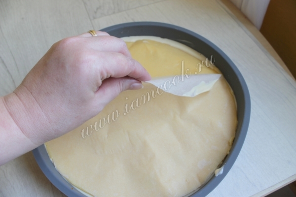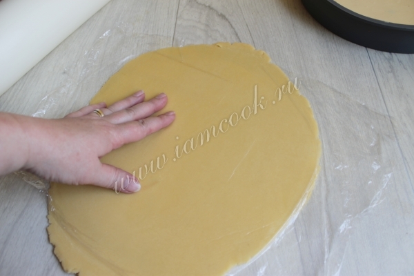 Теперь берем наше тесто, раскатываем его, лучше на бумаге, вырезанной по размеру формы. Я раскатывала через пленку.