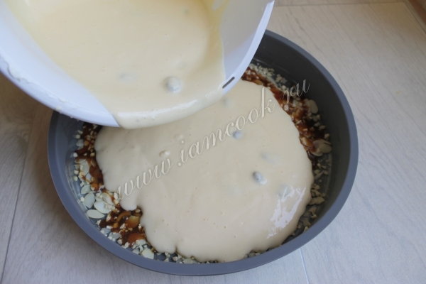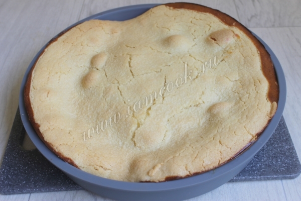 Пирог во время выпечки поднимется, но пусть вас это не пугает, он потом опустится как ему надо. Даем остыть 30 минут в форме затем накроем блюдом и перевернем его.