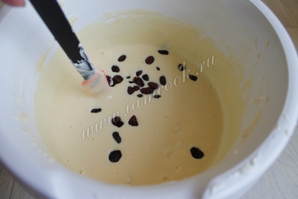 Для начинки смешаем творог, сметану пудинг, сахар. Все взбиваем и добавляем яйца. В конце добавим изюм или как у мeня вишня вяленая.