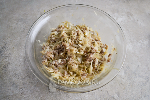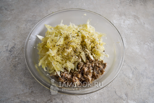 В миске соедините мясной фарш, обжаренный лук. Отожмите сок из капусты руками и добавьте в миску. Посыпьте черным молотым перцем и солью.