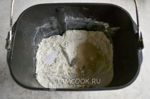 Первым делом замесите тесто. Это можно сделать руками, в планетарном миксере или, как в рецепте, в хлебопечке. Просейте в ведерко муку, добавьте дрожжи, сахар и соль.