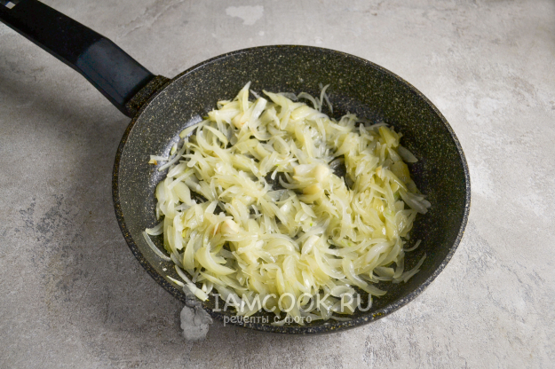 Лук очистите, нарежьте соломкой. Сначала обжарьте на растительном масле до аромата нарезанный чеснок, затем положите лук и обжарьте до легкого золотистого цвета.