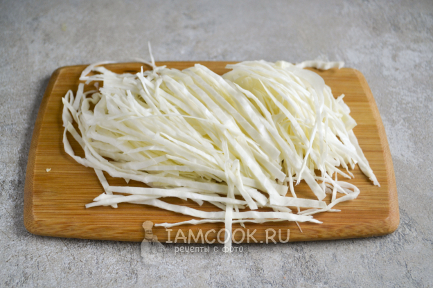 Пока тесто замешивается, займитесь начинкой. Капусту очистите от верхних жестких листьев и нарежьте тонкой соломкой. Чуть-чуть присыпьте капусту солью и помните руками.