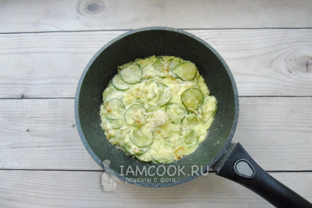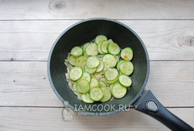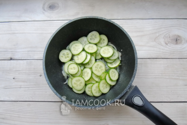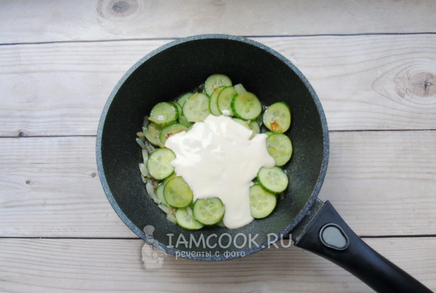 Добавьте эту смесь в сковороду с луком и огурцами. Перемешайте и тушите 2-3 минуты.