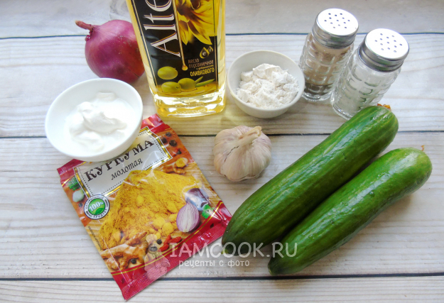 Соберите ингредиенты для приготовления тушеных огурцов в сметане.