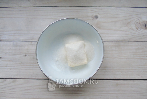 Выложите в миску мягкое сливочное масло и насыпьте сахар.