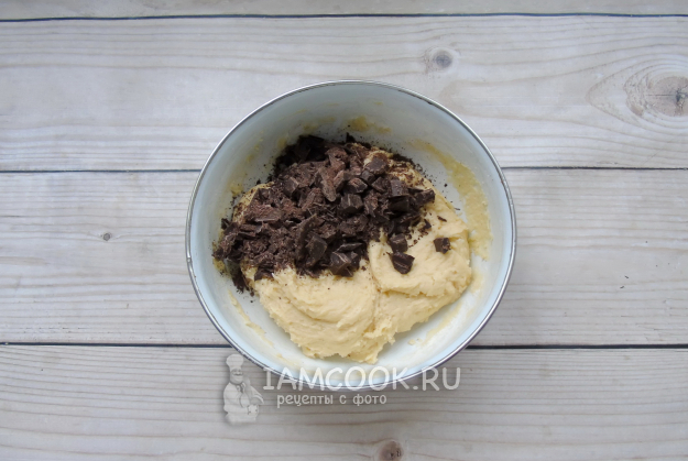 Шоколад нарубите ножом, предварительно охладив его в морозильной камере 15-20 минут. В твердом виде он легко крошится. Размер крошки выбирайте по вкусу.