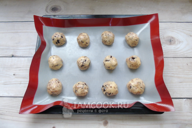 Из приготовленного теста сформируйте шарики размером чуть больше грецкого ореха и выложите в форму для запекания с пекарской бумагой или силиконовым ковриком.