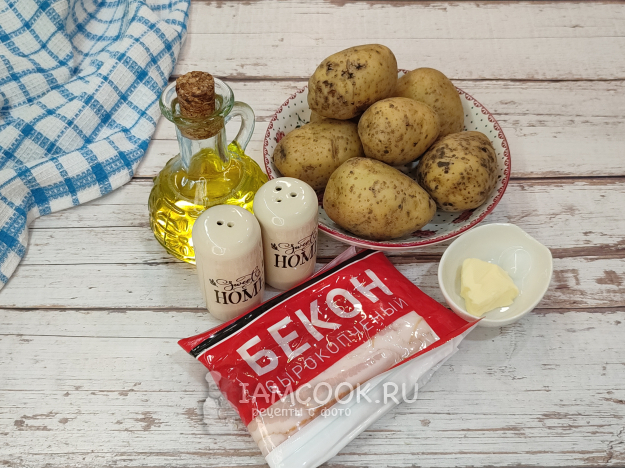 Соберите ингредиенты для приготовления начинки для вареников с картошкой и беконом. Бекон подойдёт и сыровяленый, и варено-копченый, какой больше нравится.