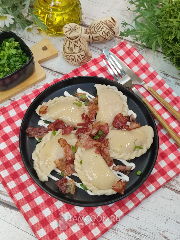 Можно подать вареники, просто добавив к ним кусочек сливочного масла, например. Я на дно тарелки выкладываю немного сметаны, потом горячие вареники, присыпаю их поджаренным беконом и свежей зеленью. Вкусно... Сил нет😆. Приятного аппетита🤗!!