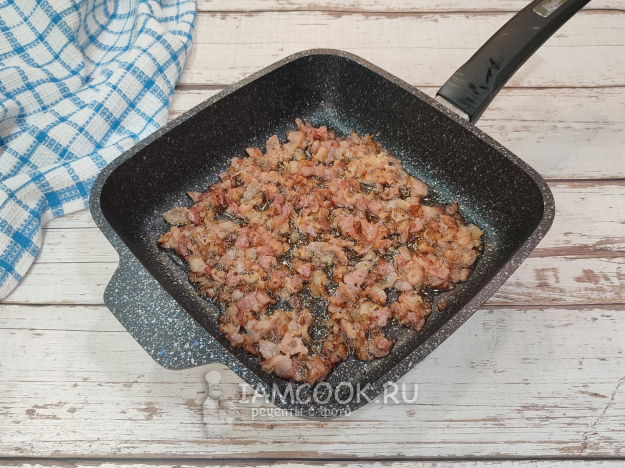 Для начинки бекон нарежьте мелким кубиком, обжарьте с 1 ст. л. масла до румяности.