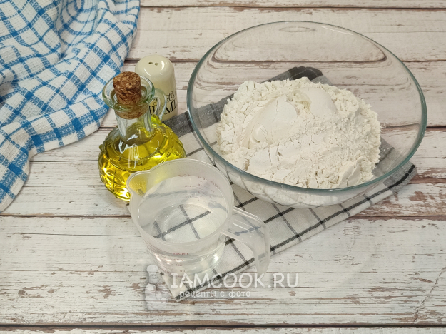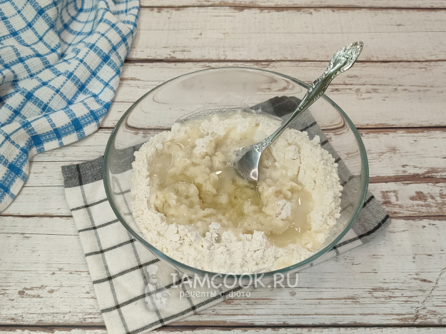 В миску всыпьте муку, сперва не всю, а граммов 300, соль, масло, влейте кипяток, перемешайте будущее тесто сначала ложкой.