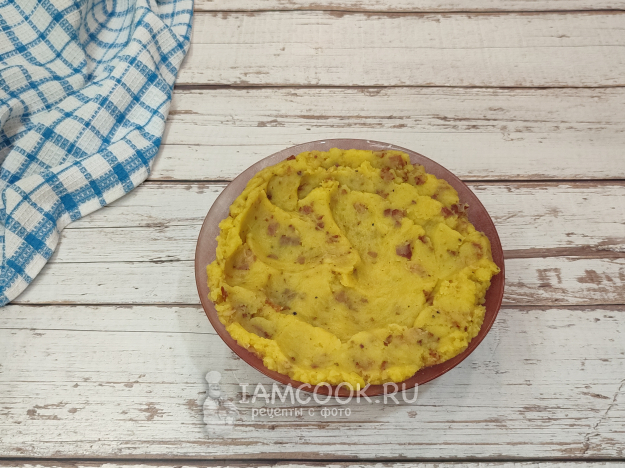 Отваренный картофель разомните в пюре, добавьте сливочное масло, обжаренный бекон вместе со всем жиром, который вытопился. Посолите, поперчите по вкусу. Чтобы начинка быстрее остыла, переложите ее в плоскую тарелку.