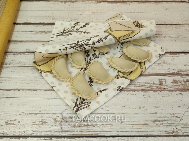 Кладем в каждую заготовку начинку и скрепляем края так, как вам удобнее. Выкладываем на доску, припыленную мукой, или, как я, на чистое сухое полотенце. И не забываем прикрывать наши изделия, чтоб они не сохли.