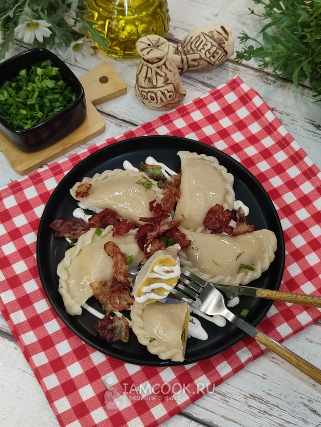 Варим в кипящей подсоленной воде примерно 3-4 минуты после того, как вареники с картошкой и беконом всплывут.