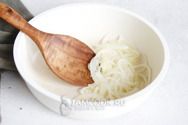 На оливковом масле (1 ст.л.) слегка пассеровать лук, до мягкости.