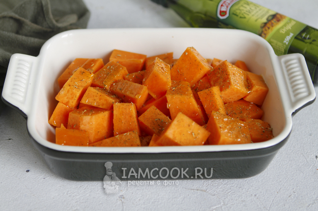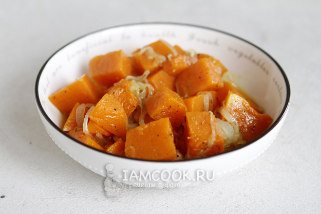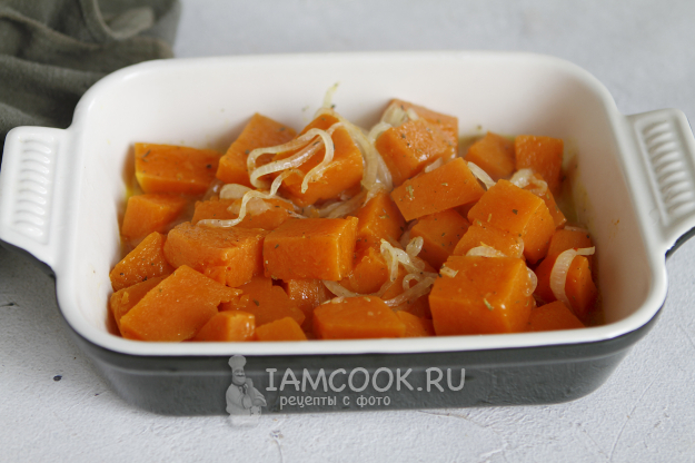 Запекать тыкву с луком в духовке 20-25 минут при 200 градусах. Если не будете прикрывать форму фольгой, то обязательно следите, чтобы кубики тыквы не пригорели, поэтому переворачивайте их по необходимости.