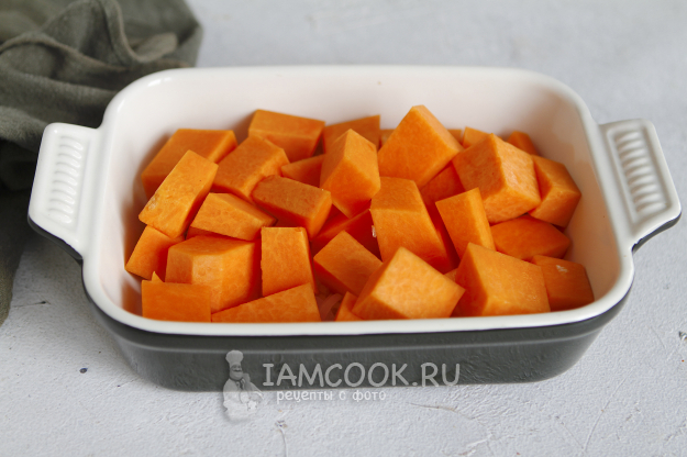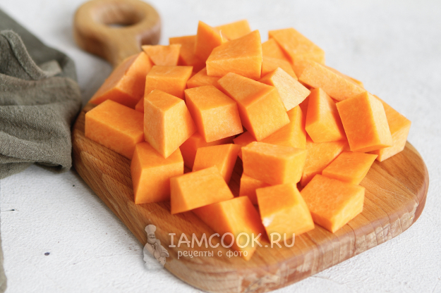 В зависимости от того, как вы будете использовать запеченную тыкву, и стоит ее нарезать. Тыкву с луком я готовила для салата. Тыкву почистить и нарезать на небольшие квадратики, толщиной примерно 1,5-2 см.