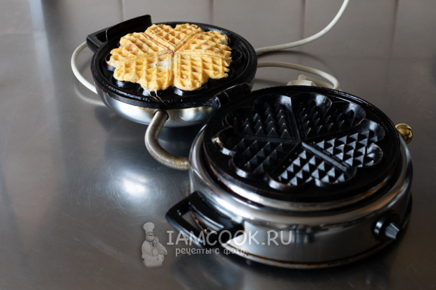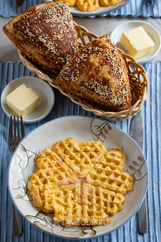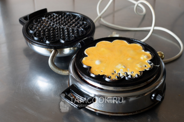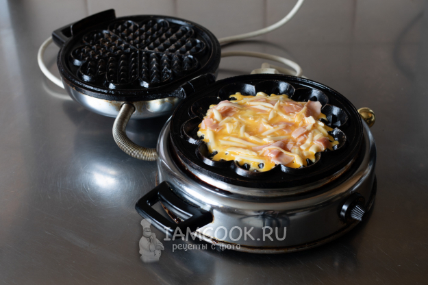 Если вафельница прогрелась, то можно начинать выпекание омлета.