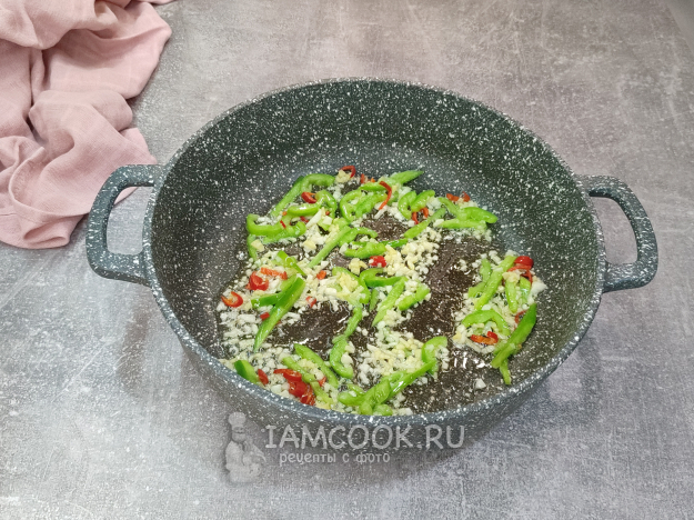Идём к плите. В сковороде с разогретым маслом обжарьте чили, чеснок и имбирь, буквально 20-30 секунд, постоянно помешивая.