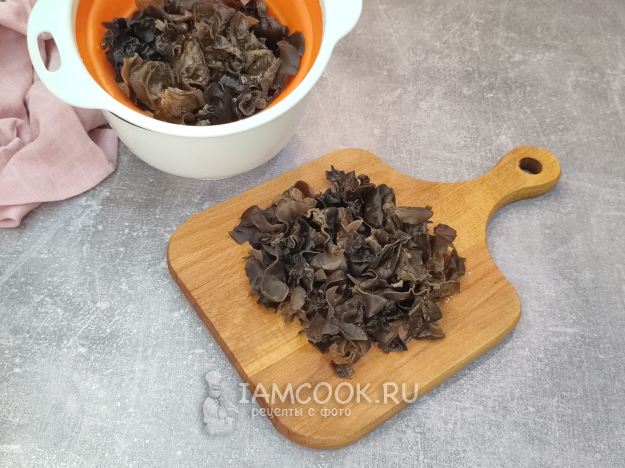 Пока мы нарезали овощи, за какие-то 10-15 минут грибы напитались влагой и весьма увеличились в размере👍. Промойте грибы, откиньте на сито.