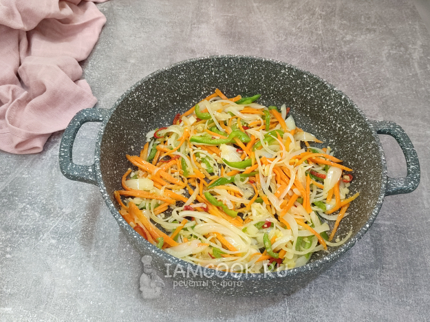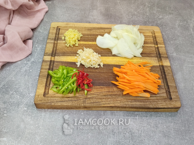 Тем временем нарежьте лук, морковь, перец соломкой, а чеснок и имбирь измельчите.