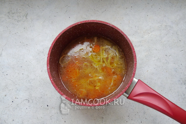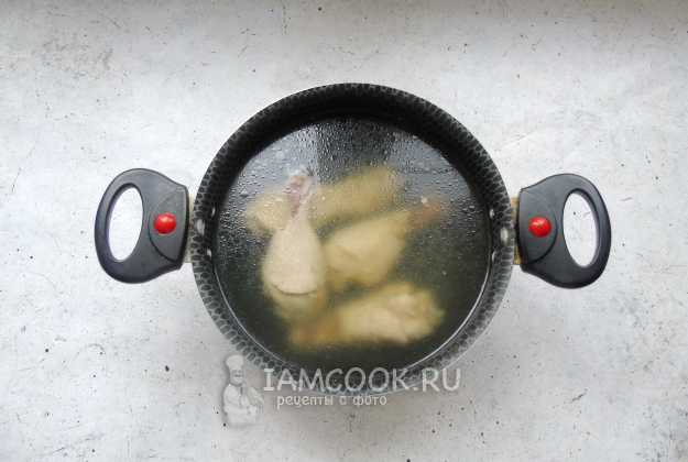 Сварите куриный бульон. Курицу помойте и выложите в кастрюлю. Налейте воду, доведите до кипения и огонь убавьте. Затем снимите пену и варите курицу до готовности. Чтобы бульон был прозрачным, готовьте его в кастрюле с приоткрытой крышкой, тогда кипение станет минимальным.