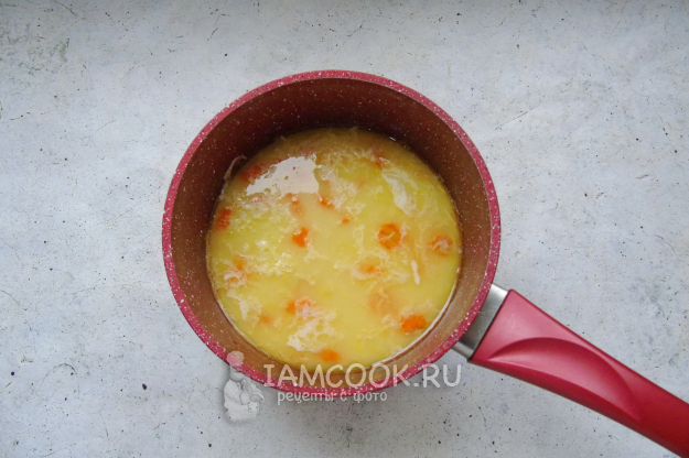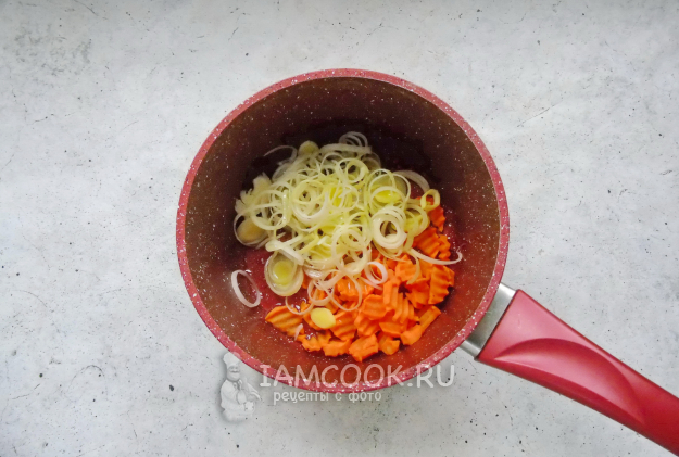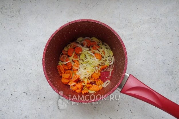 Морковь очистите, помойте и нарежьте произвольно. Лук-порей помойте и нарежьте кольцами. Выложите овощи в кастрюлю с антипригарным покрытием или толстым дном.