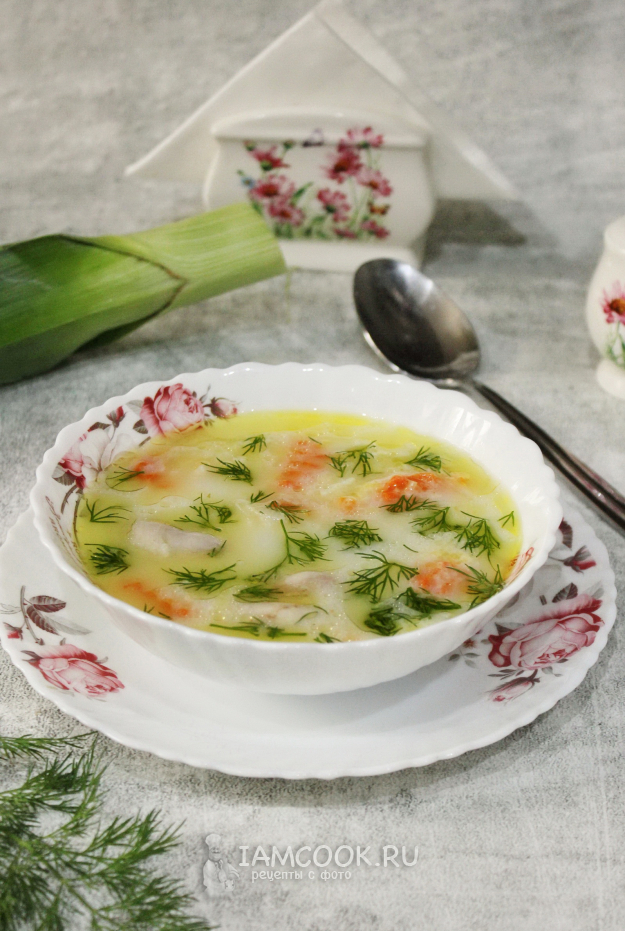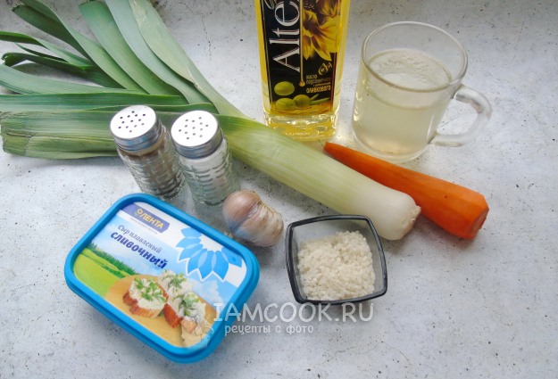 Соберите ингредиенты для приготовления сырного супа с луком-пореем.