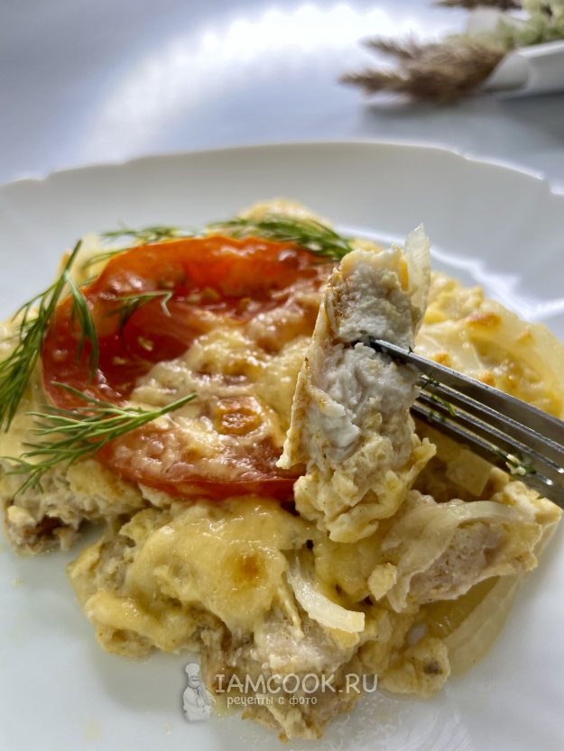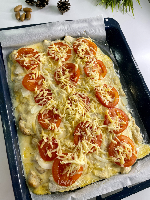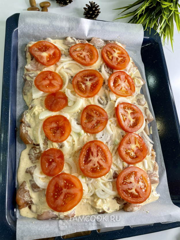 Затем кладем лук, нарезанный полукольцами. Сверху выкладываем помидоры. Накрываем противень фольгой и убираем в заранее разогретую до 200 градусов духовку на 25 минут.