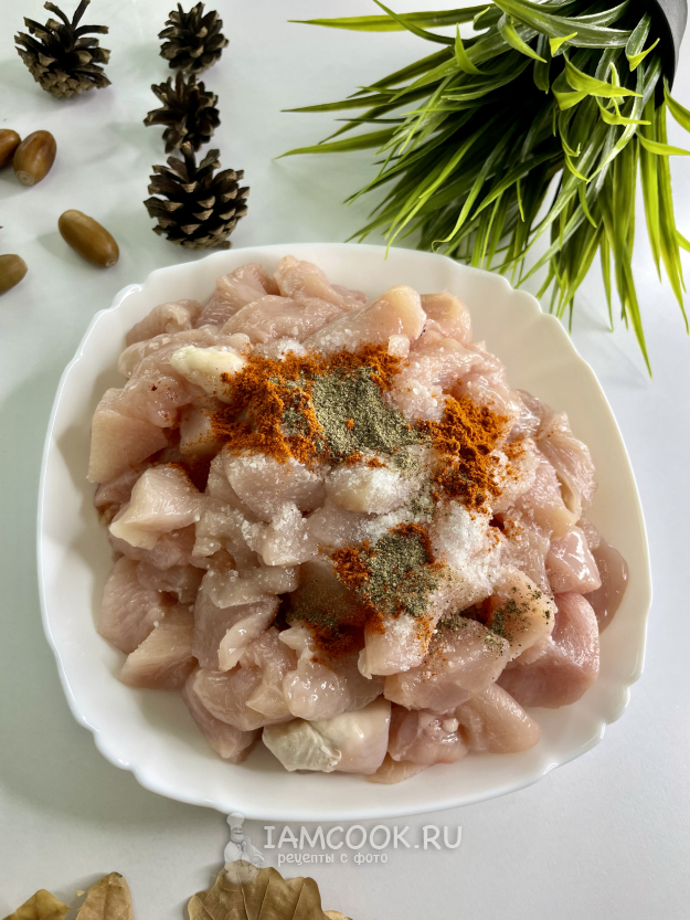 Нарезаем филе кубиками. Добавляем соль, перец, паприку и перемешиваем.