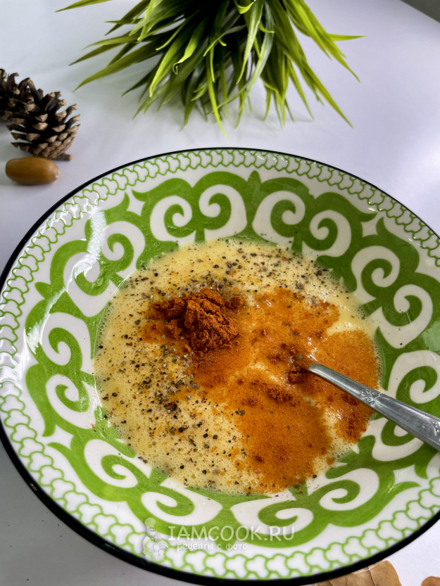 Сыр натираем на крупной тёрке. Убираем в сторонку. В чашку разбиваем 2 яйца и слегка взбиваем вилкой. Добавляем соль, смесь перцев, паприку и перемешиваем.